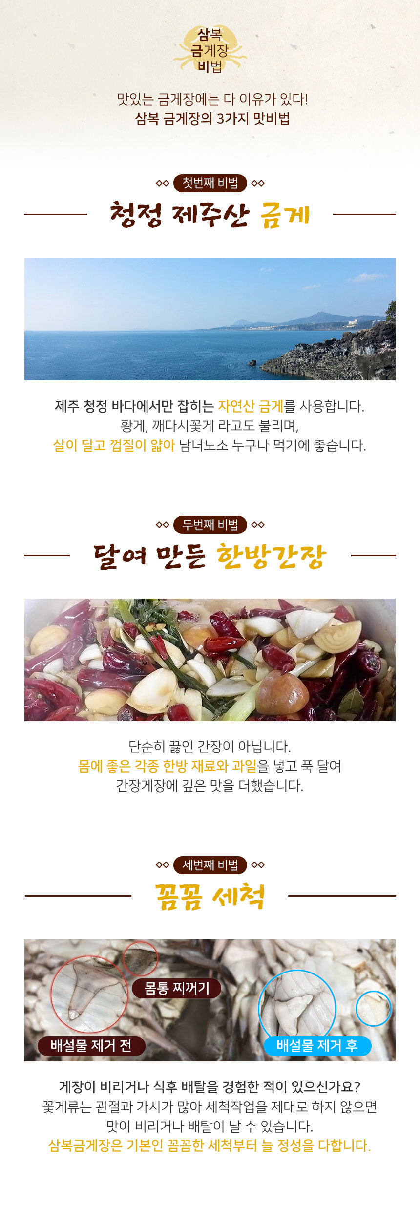삼복금게장은 대표님이 제일 중요하게 생각하는게 좋은 품질의 국산재료와 세척입니다.
